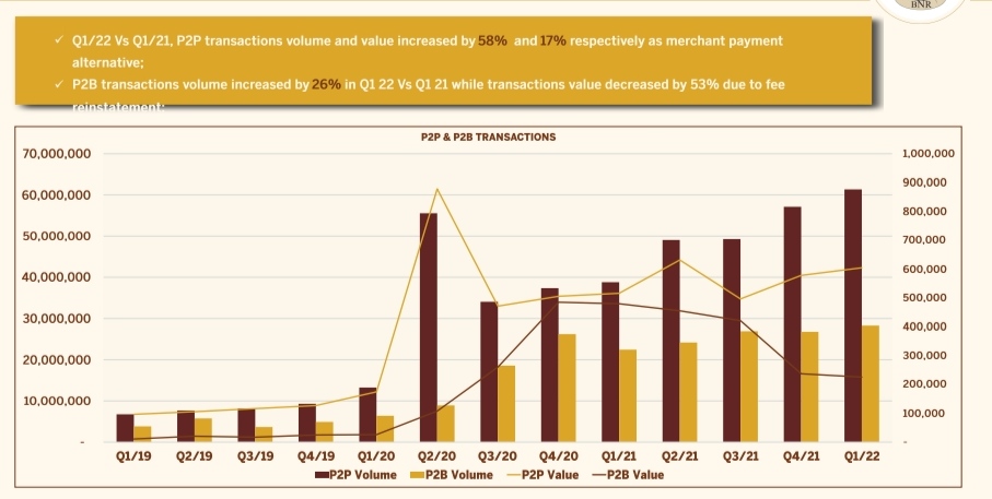 According to central bank, the person to person (P2P) volume transactions almost doubled in 2022 Q1 compared to 2021 Q1 and increased by almost 5-fold compared to 2020 Q1 (pre-covid 19) to 61.3 million transactions during 2022 Q1.