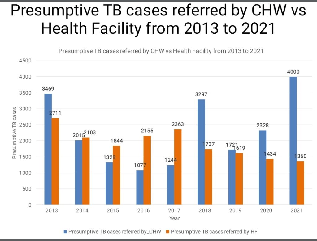 Part of the training also involves case identification, whereby CHWs are advised that if somebody has persistent coughs for about two weeks, they should be brought to the hospital. Thus, they go to the community and on identifying such cases, they take them to the hospital, where they are tested and put on medication.